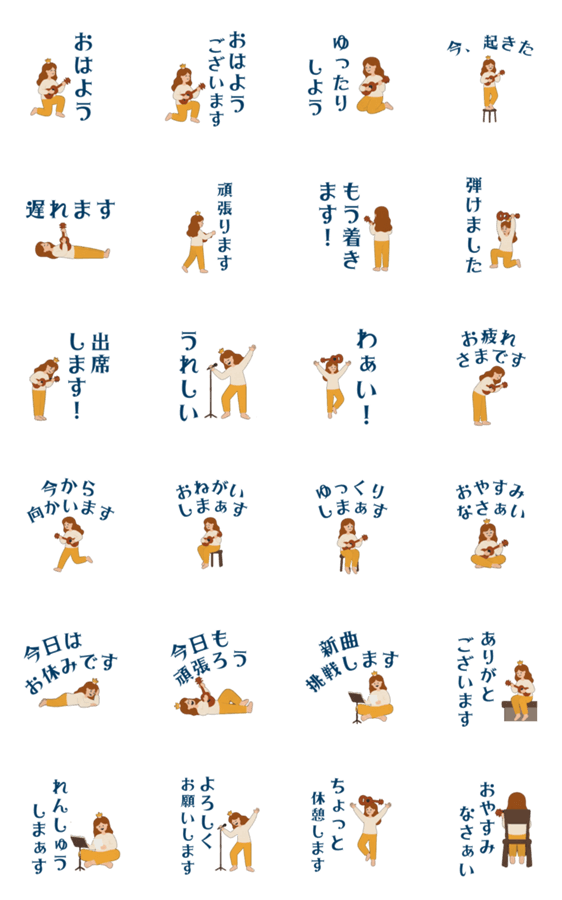 | スタンプ説明 | Meet the delightful Ukulele Girl! From joyful jumps to serene strumming, add a musical and happy flair to your chats. Let her cheerful spirit shine! |