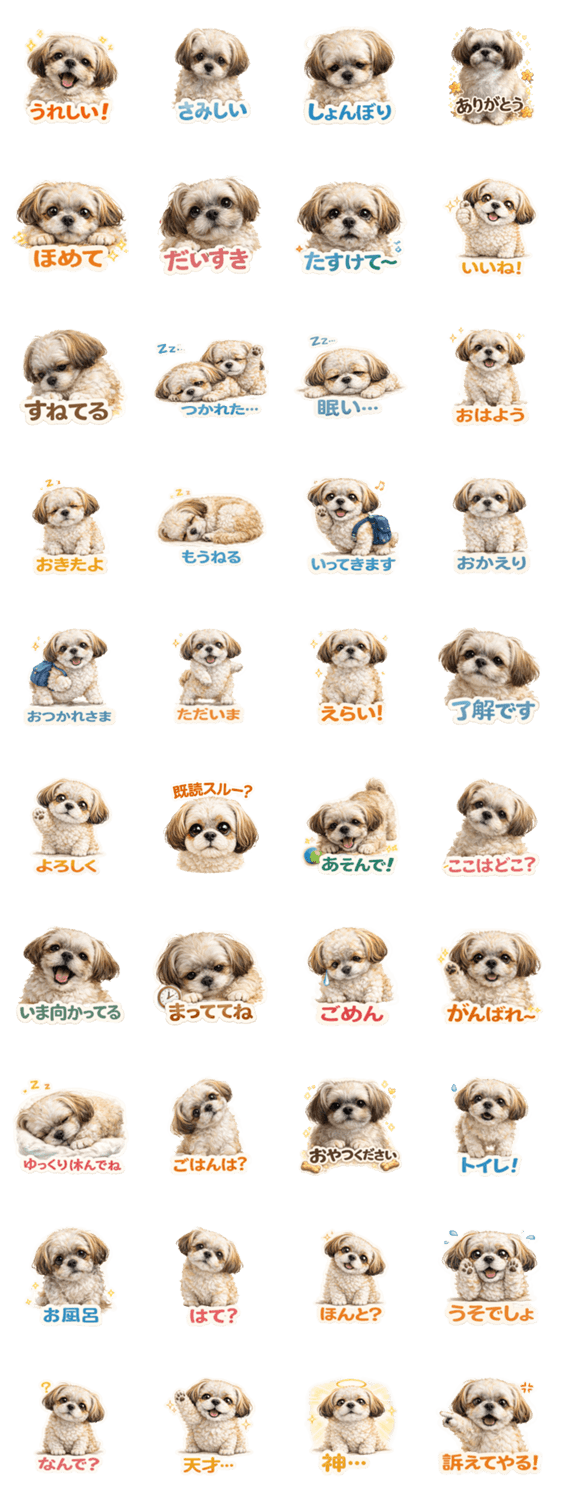 | スタンプ説明 | うるうる目がたまらない、シーズーのスタンプです。 日常で使いやすい言葉から、甘えんぼうなセリフまでたっぷり40種類。 犬好きさんにおすすめのもふもふスタンプです。 |