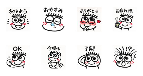 | スタンプ説明 | 大きな目と真っ赤なほっぺ、ぱっつん前髪がチャームポイントの女の子です。日常の挨拶や「今帰る」「着いた」など、毎日使いやすいスタンプが揃っています。 |