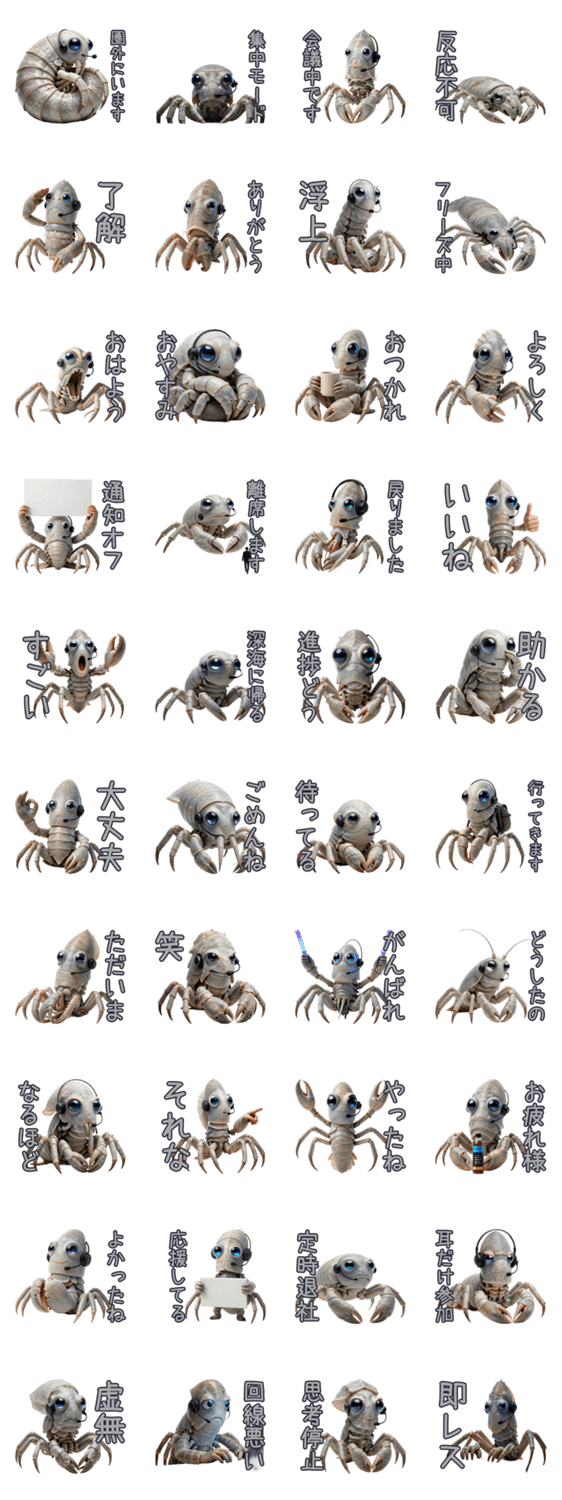 | スタンプ説明 | 深海から絶対に出ない在宅ダイオウグソクムシが登場。インドア派や仕事に行きたくない友達へ、シュールな挨拶と強い帰宅願望でオフライン生活を宣言しよう。 |