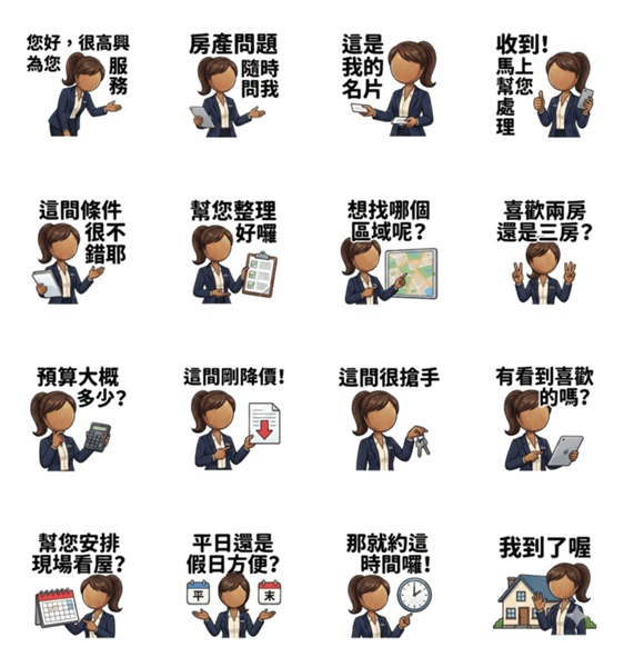 | スタンプ説明 | A realtor sticker set designed for first contact and client outreach. Quickly respond, recommend properties, and arrange viewings to improve conversation flow. |