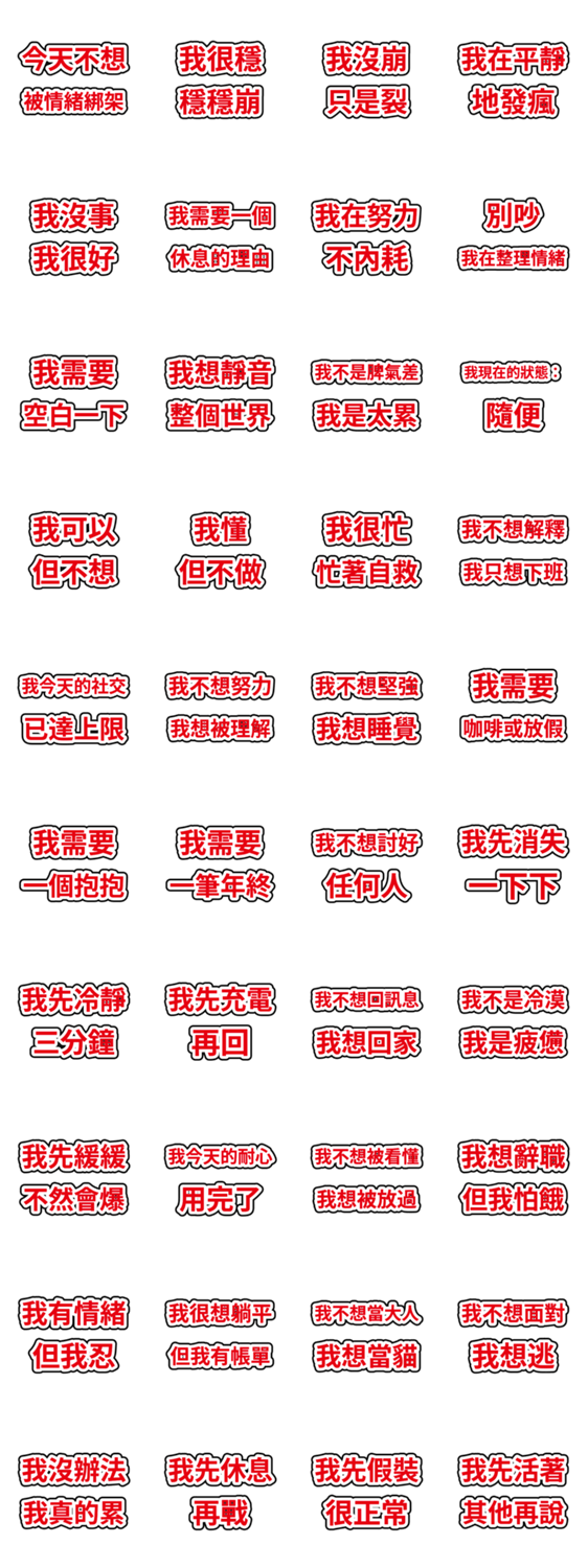 | スタンプ説明 | Low battery mood lines for busy workdays: overwhelmed, cracked, need a recharge, take a breath. |