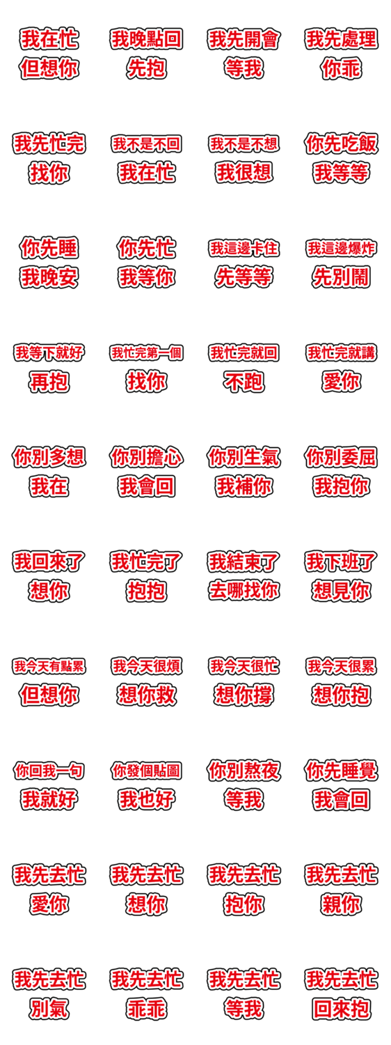 | スタンプ説明 | Warm replies for when you are busy. Bold red text with black and white outline on a transparent background. |