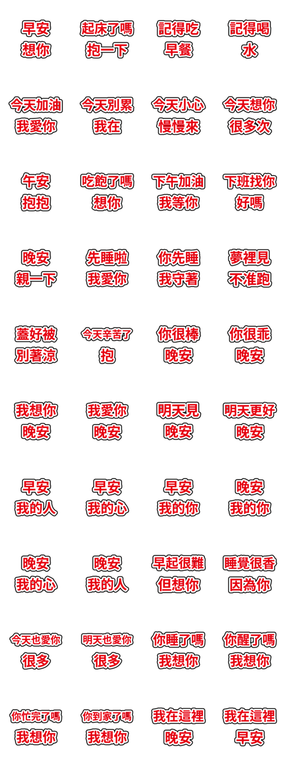 | スタンプ説明 | Daily greetings and caring lines for couples. Bold red text with black and white outline on a transparent background. |