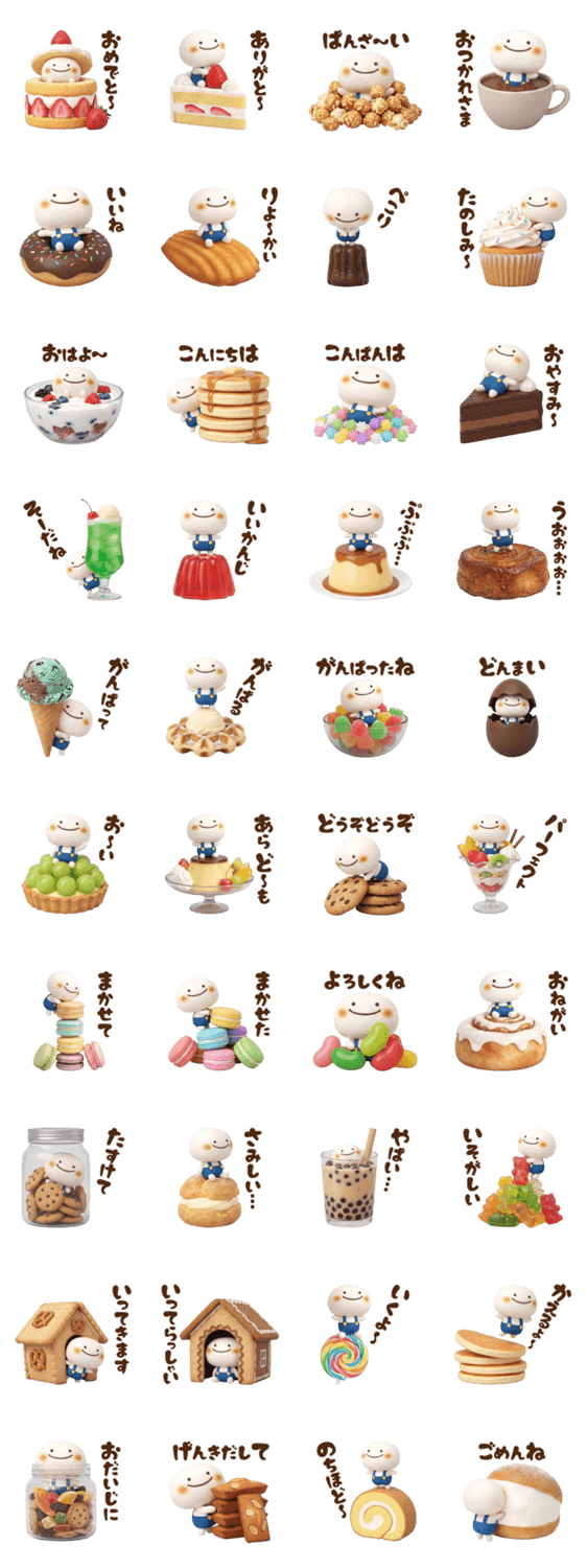 | スタンプ説明 | 焼きマシュマロのマシューがスイーツに添えられて大奮闘!ケーキ、ドーナツ、アイスクリーム、タルト、マカロン等、甘い物好き集まれ♪芋ジャージの名前スタンプのくーが作 |