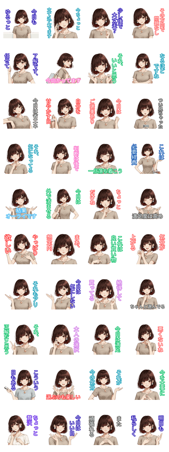 | スタンプ説明 | 大人だけど、つい散財。日常会話で使いやすいフレーズに、ちょっとした「散財あるある」を添えた大人な散財系女子のLINEスタンプです。 |