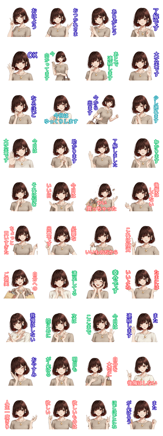 | スタンプ説明 | 大人だけど、つい散財。日常会話で使いやすいフレーズに、ちょっとした「散財あるある」を添えた大人な散財系女子のLINEスタンプです。 |