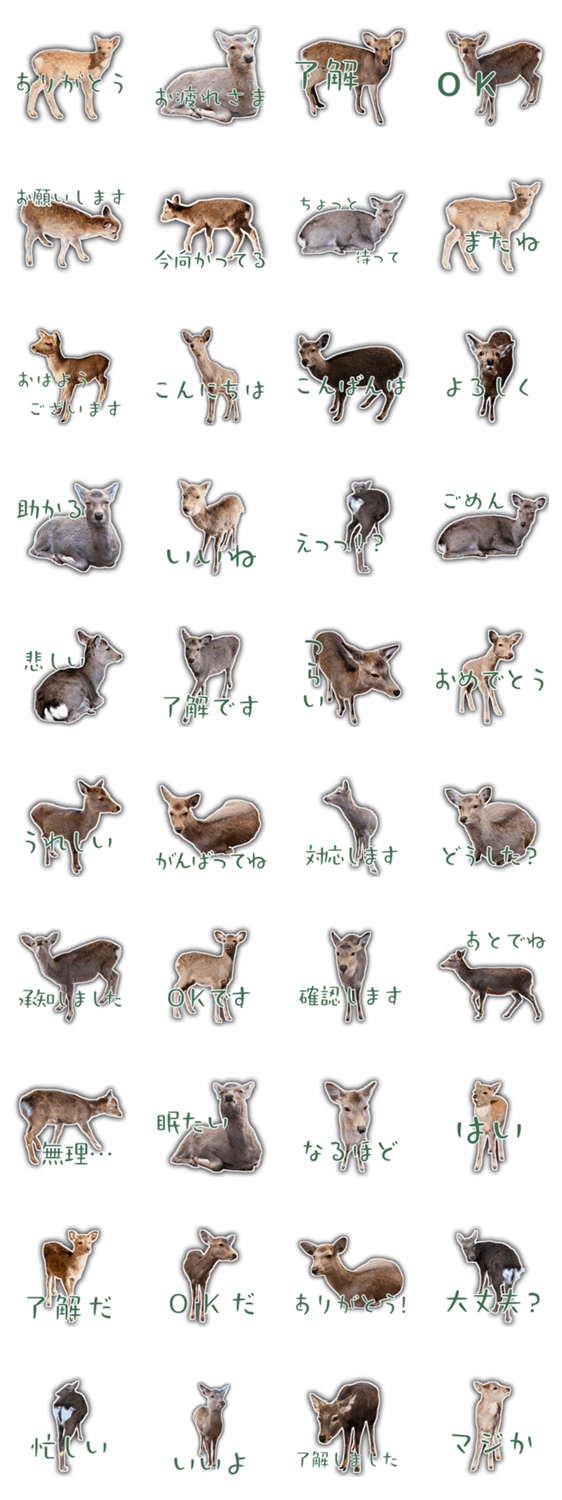 | スタンプ説明 | 鹿 しか シカ 奈良 あいさつ、ありがとう、了解など、毎日使える言葉をたっぷり収録。 シンプルで見やすく、仕事でもプライベートでも使いやすいスタンプです。 販売情報 |