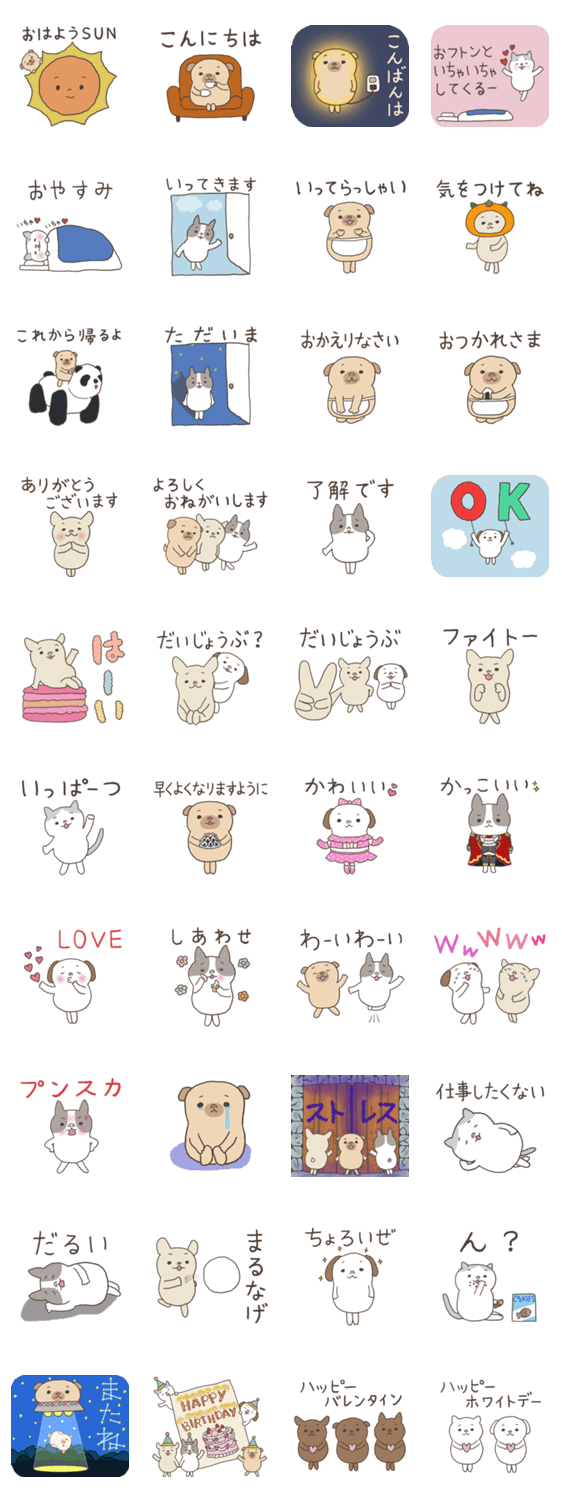 | スタンプ説明 | パグさん フレブルさん ボステリさん シーズーさん エキゾチックさんのかわいいハナペチャさん達が 毎日使える挨拶や誕生日 バレンタイン ホワイトデー 等気持ちをお届け♡ |