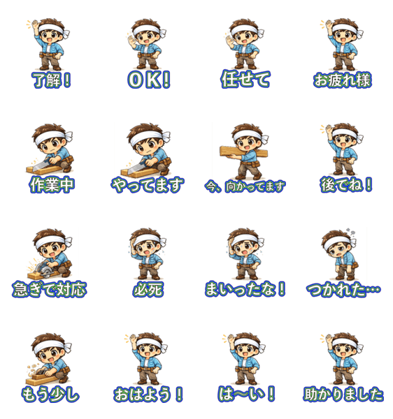 | スタンプ説明 | かわいい大工さんのLINEスタンプです。 作業中・OK・おつかれ・疲れた時など、 お仕事中や日常会話で使いやすい 全16種類をセットにしました。 |