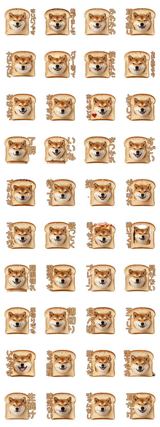 | スタンプ説明 | 食パンに収まった柴犬のシュールでじわじわくるスタンプ。虚無な表情で返信します。犬好きやパン好き、少し変わったネタ系が好きな方に最適です。 |