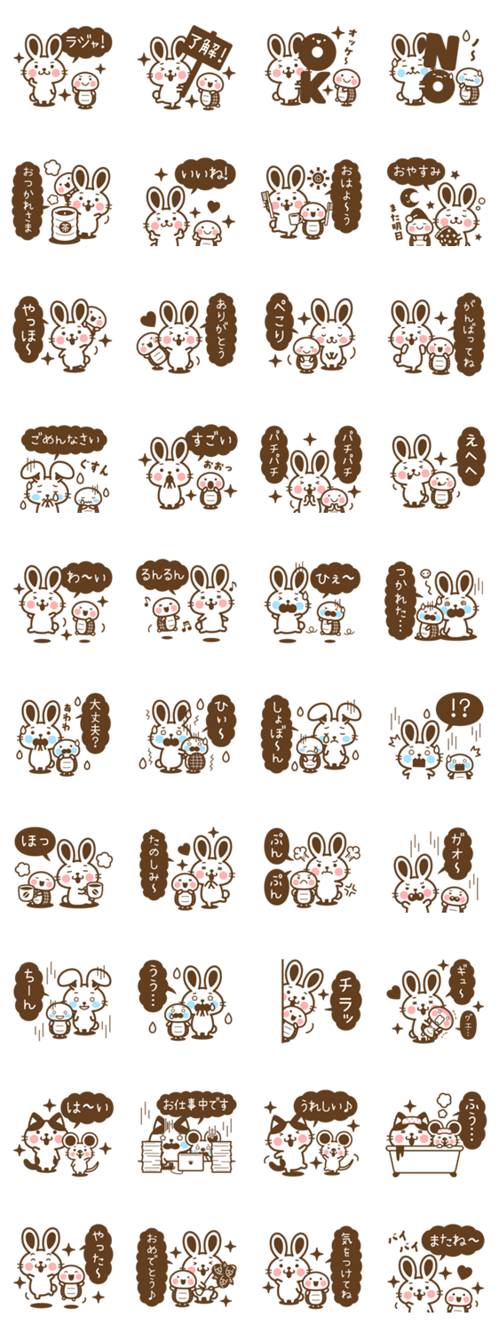 | スタンプ説明 | 簡単な返信でも使いやすい、毎日使える兎(ウサギ)さんと亀(カメ)さん、ちょこっとだけハチワレの猫(ネコ)さんと鼠(ネズミ)さんのふきだし文字スタンプの白黒版です。 |
