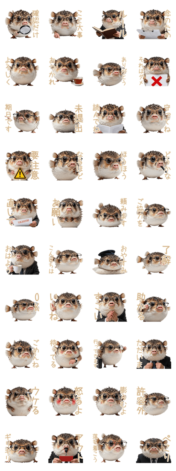 | スタンプ説明 | 怒ると膨らむフグが体を張って注意喚起。言いづらい指摘やルールのお願いも、かわいいお魚なら角が立ちません。シュールで面白い海の生き物スタンプ。 |