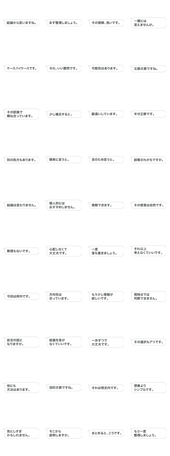 | スタンプ説明 | AI構文/チャッピー構文/吹き出し/セリフ/日常会話/毎日使える/肯定/共感/結論/分析/解析/面白い/楽しい/相談/チャットボット/敬語/丁寧語/挨拶/流行/予測/ロボット |