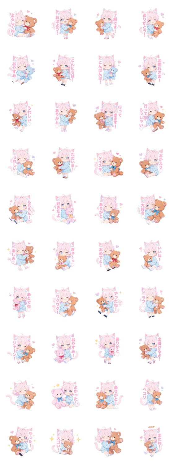 | スタンプ説明 | ねこ/猫/猫耳/かわいい/可愛い/量産型/ピンク/日常/挨拶/ふわふわ/パステル/女の子/女子/ガーリー/ミニキャラ/キュート/ファンシー/毎日使える/くま/ぬいぐるみ/癒し |