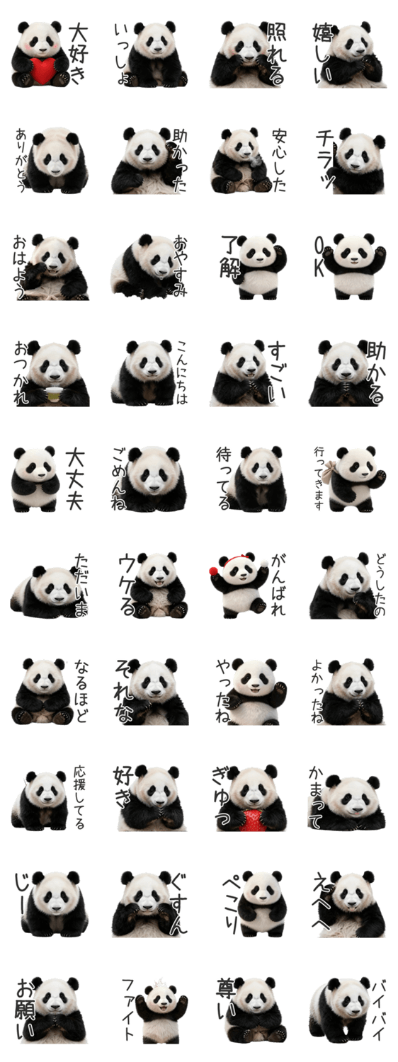 | スタンプ説明 | ふわもちパンダベビーが照れながら、好きや感謝を伝えます。挨拶や応援など、日常で使いやすい癒しのスタンプです。 |