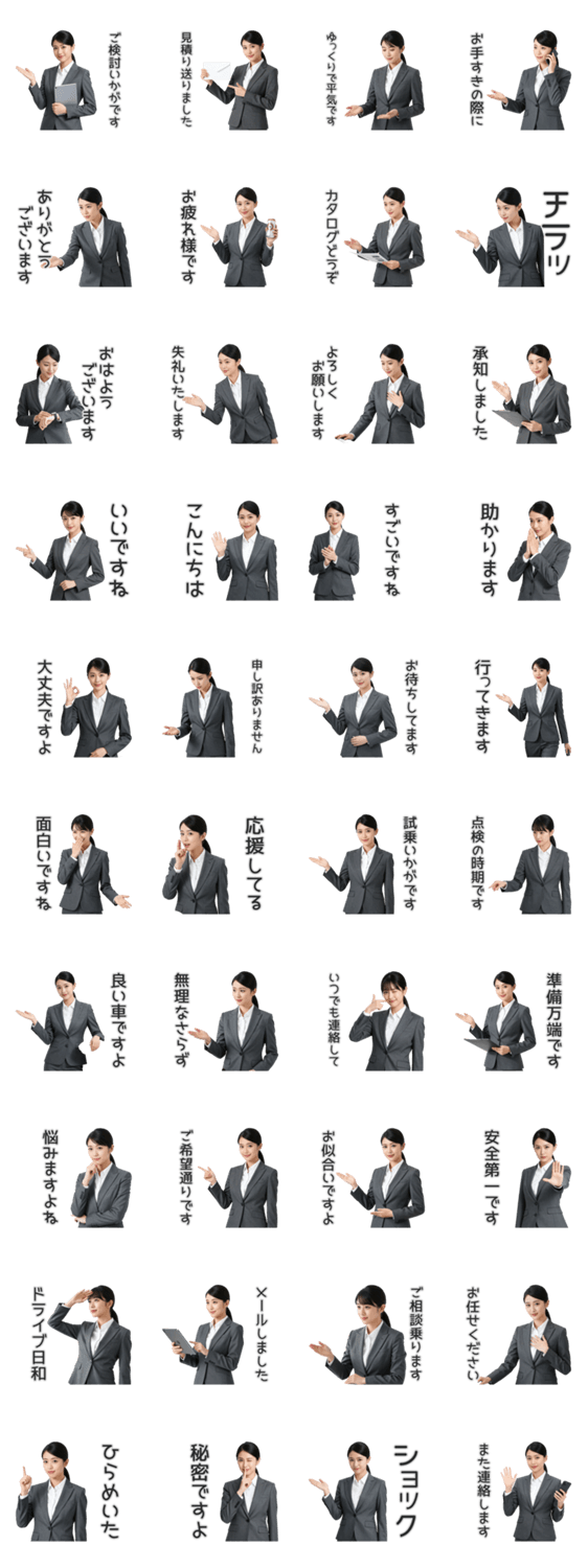 | スタンプ説明 | カーディーラー営業レディが車用語で意味深に語りかけます。普通の点検案内もダブルミーニングに?仕事や日常で使える敬語も満載のシュールなネタスタンプです。 |
