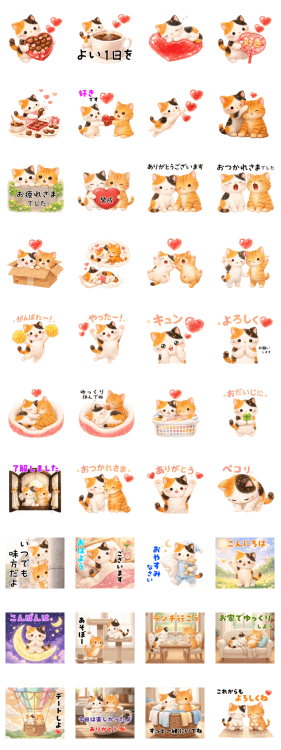 なかよしなねこカップルの、日常会話からバレンタインまで使える、かわいい猫スタンプです。