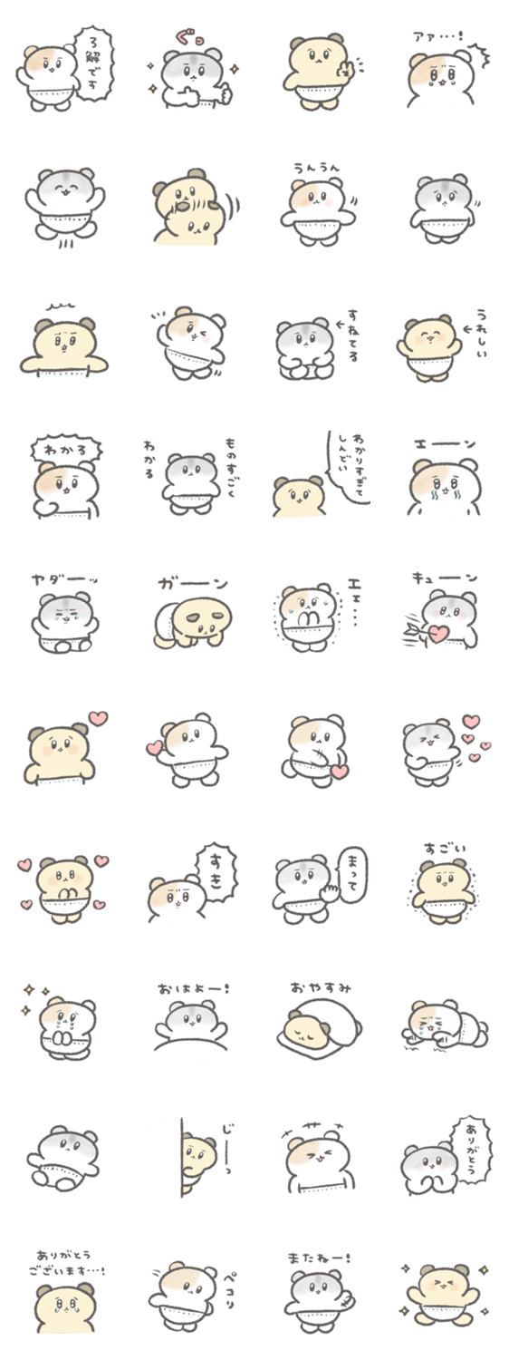 | スタンプ説明 | 文字少なめ相槌多めです。 日常/毎日使える/はむすたー/ハムちゃん/ゴールデンハムスター/キンクマハムスター/oroninet |