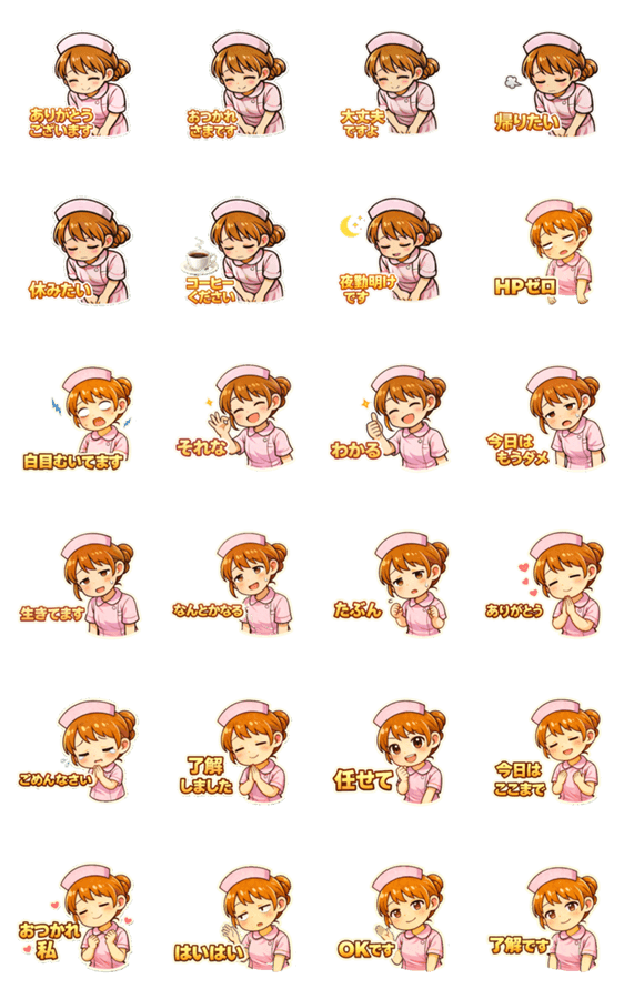 | スタンプ説明 | ちょっと本音が漏れがちな看護師さんのスタンプです。 忙しい日常や職場、友だちとの会話で使いやすい、控えめだけどリアルなひと言を集めました。 |