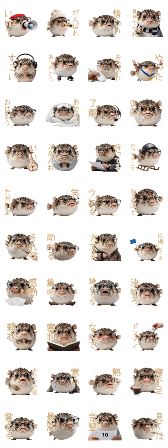 | スタンプ説明 | **怒ると膨らむフグ**が登場。冬のスポーツ観戦で感情爆発!審判への抗議や感動、寝不足まで、テレビの前で熱狂応援するネタ系スタンプです。 |