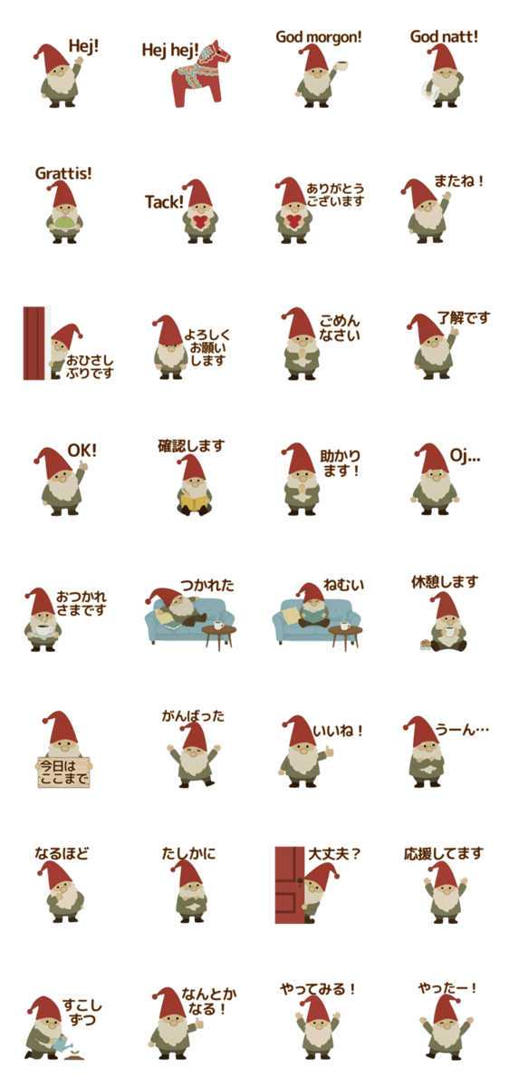 | スタンプ説明 | スウェーデンのトムテとダーラヘスト(ダーラナホース)のスタンプ32個!日常会話に使いやすく、スウェーデン語の挨拶も入っています。 |