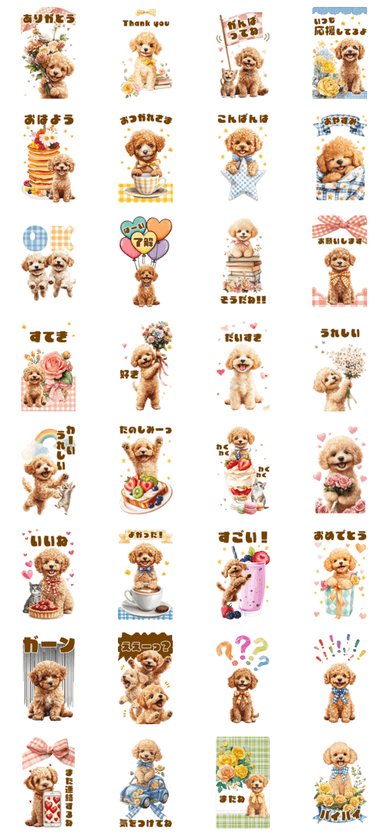 | スタンプ説明 | 「がんばってね」「応援してるよ」「ありがとう」など相手を思いやる言葉を大きく伝える子犬トイプードルのBIGスタンプです。毎日のトークにも使えます。 ※このスタンプはトークルームで大きく表示されるBIGスタンプです。 |