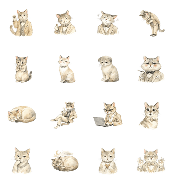 落ち着いた大人の会話に寄り添う、文字なし水彩猫スタンプ。日常の様々なシーンで上品な感情を表現できます。