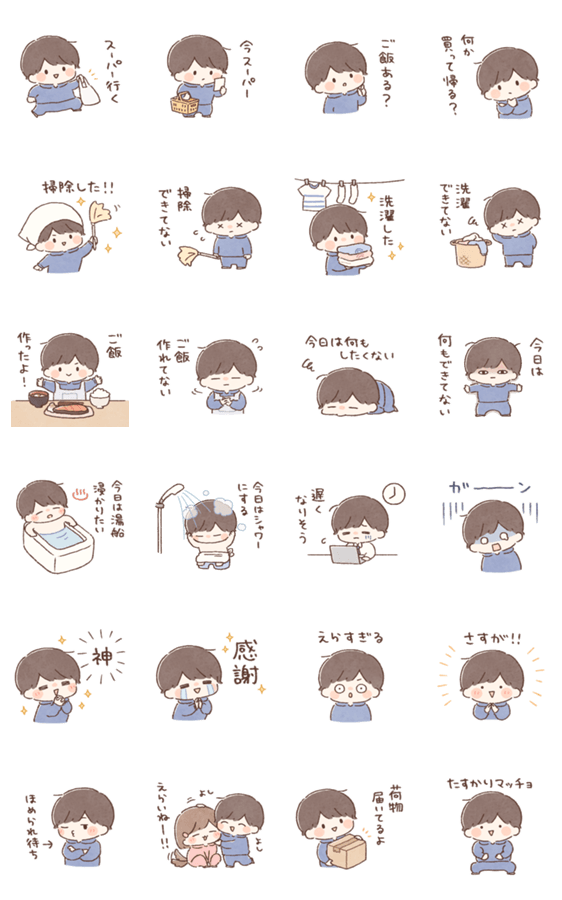 | スタンプ説明 | 今回、暗い背景でも見やすいようにイラストにも白フチがついています。(一部デザインの関係上ついてないのも含みます) 同棲/生活/男女/カップル/恋人/スタンプ |