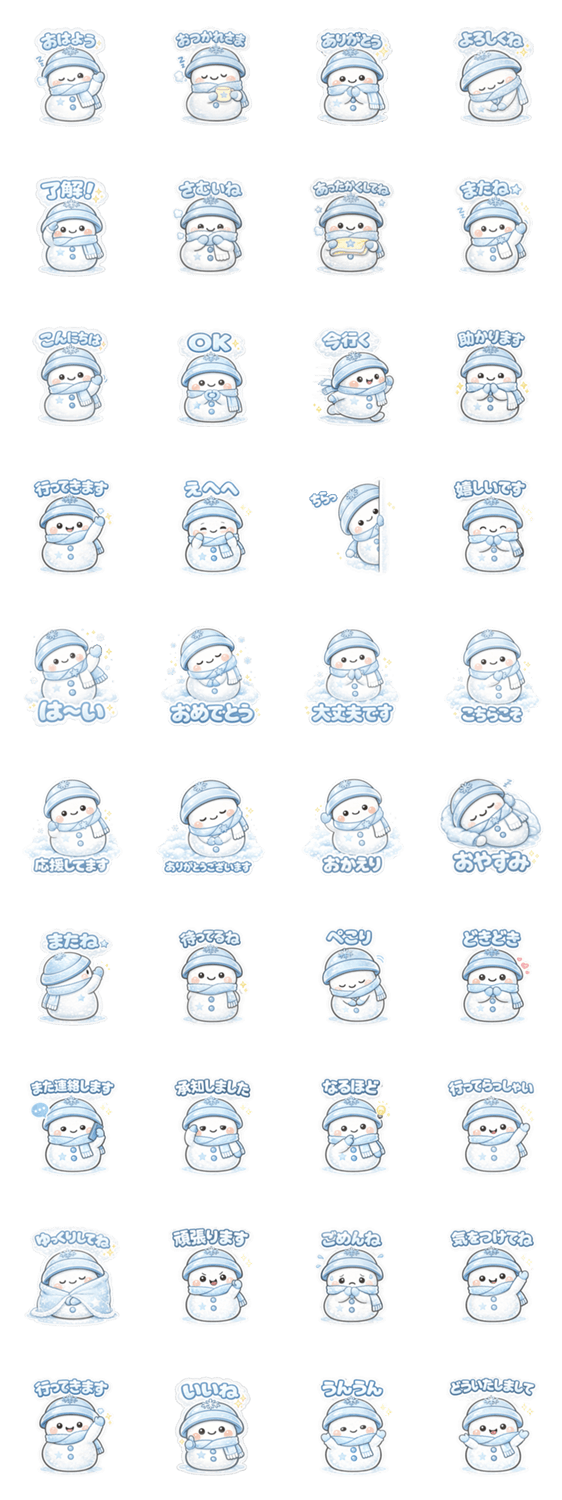 | スタンプ説明 | 白っぽい水色ゆきだるまの、ふんわりステッカー風スタンプ。 日常で使いやすいあいさつや敬語、気づかいの言葉を中心に、ほっこりかわいく気持ちを伝えられます。 |