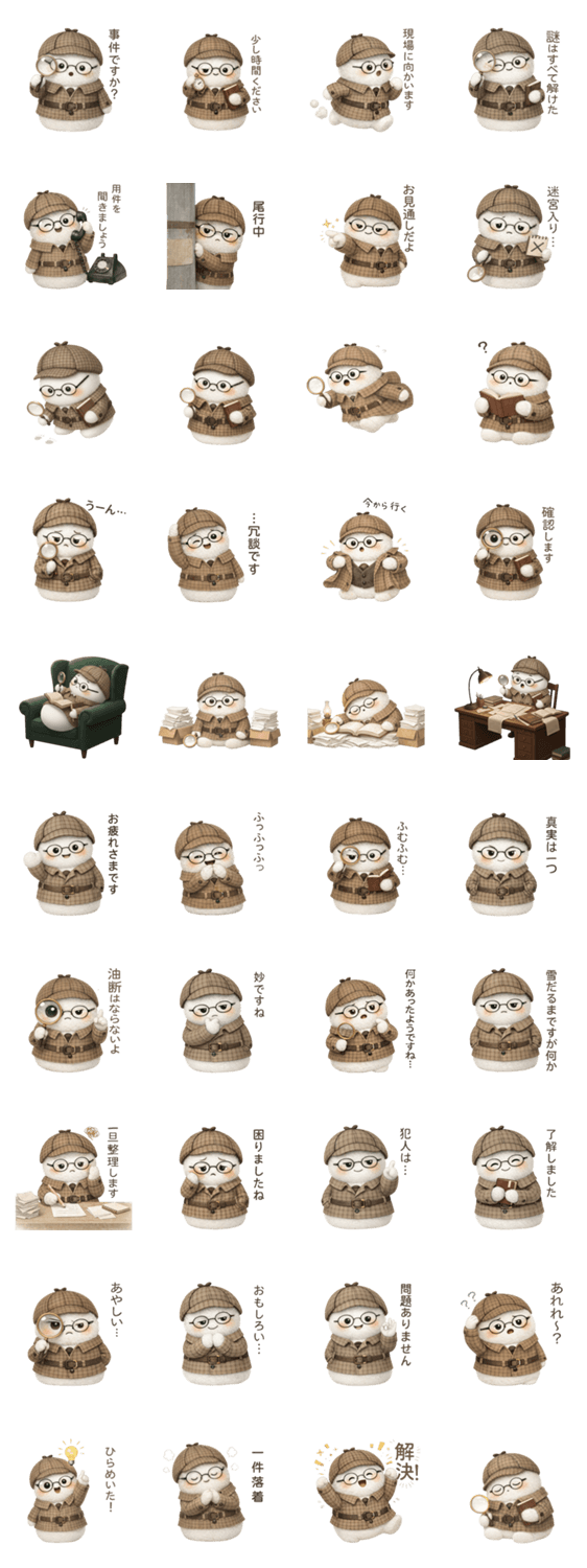 | スタンプ説明 | 日常のちょっとした事件を、ゆるっと調査中。 やさしく(たぶん)解決します。 |