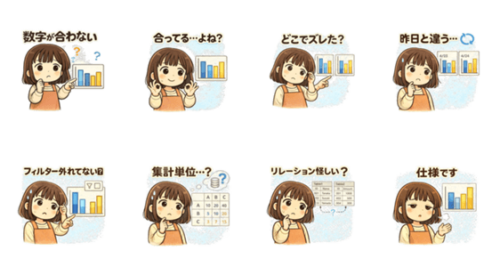 | スタンプ説明 | 数字とデータが好きな理系女子「すうちゃん」。 データ分析・Excel・会計・BI業務でよくある「数字が合わない」瞬間をゆるかわに表現しました。 |