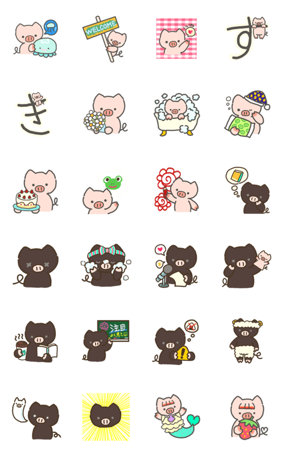 黒豚ムチ子さんと、かわいいプチ子さんのスタンプです。小さいあの子もいたりして。