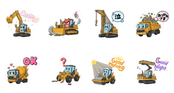 | スタンプ説明 | パワーショベルやミキサー車など毎日がんばる重機たちが、あなたのトークルームを盛り上げます!喜怒哀楽豊かな表情で、今日の気分を伝えてね! |