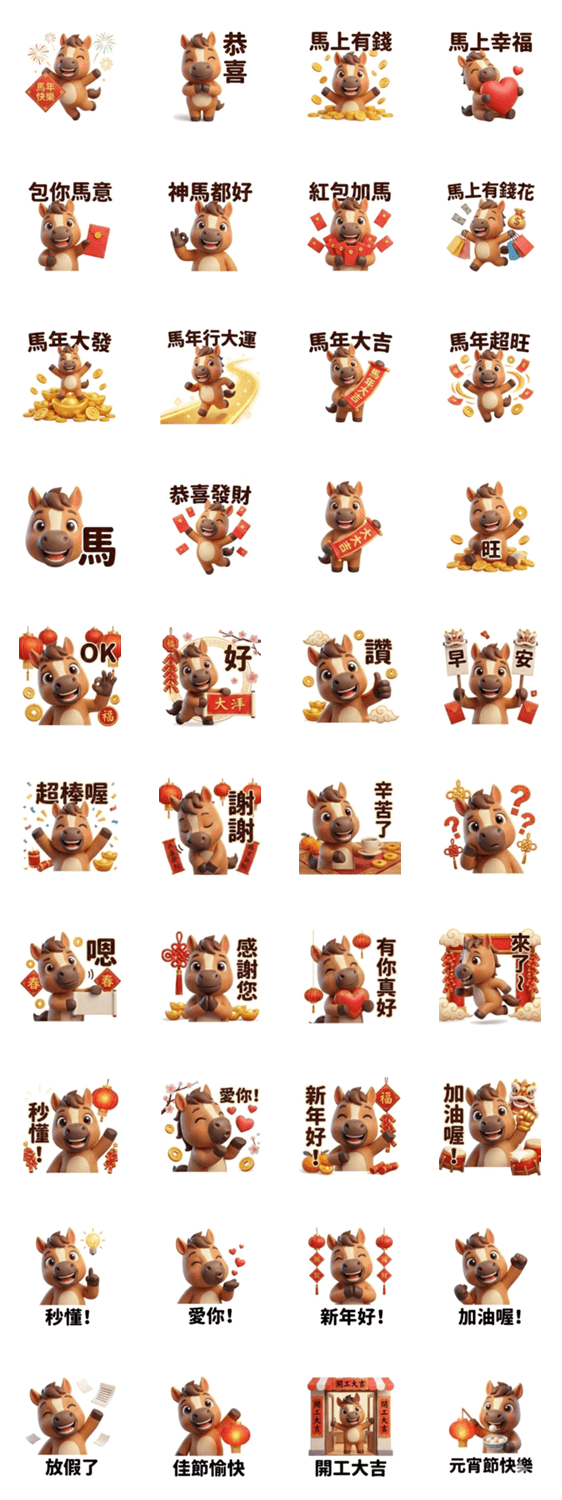 | スタンプ説明 | Celebrate the Year of the Horse with 3D Cutie Horse! Includes New Year greetings, red envelope fun, work blessings, and daily chat stickers. |