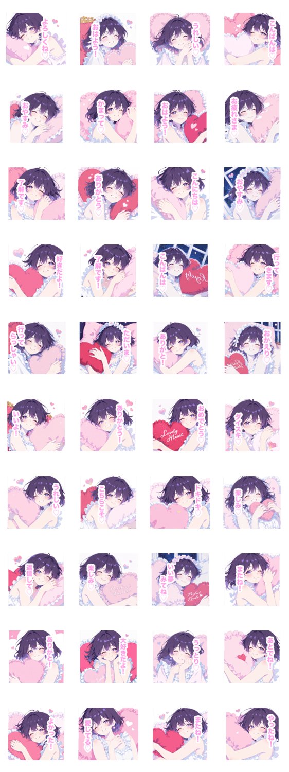 | スタンプ説明 | 量産型/地雷系/姫/女の子/女子/彼女/あざとい/可愛い/ハート/ピンク/紫髪/ショートヘア/毎日使える/日常/挨拶/パープル/依存系/甘い/ゆめかわ/フリル/リボン/クール/枕 |