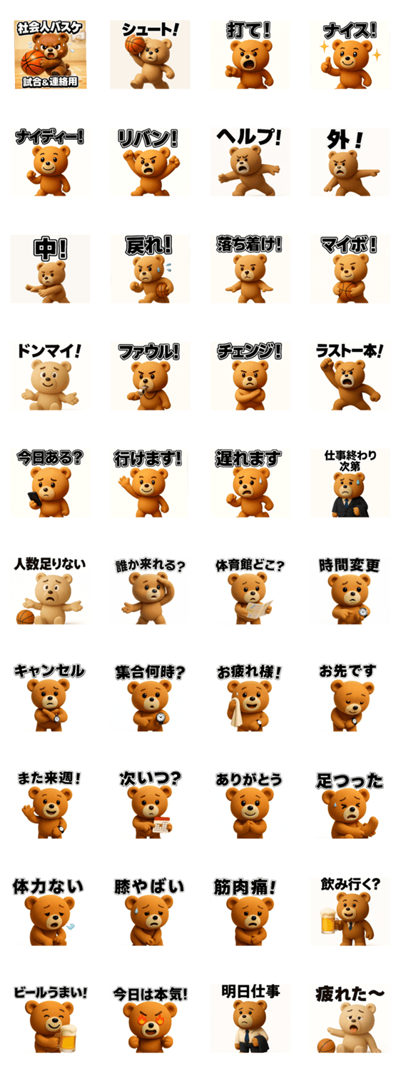 | スタンプ説明 | 社会人バスケチームで本当に使える即戦力スタンプ。試合中の指示、練習連絡、人数確認、仕事終わりのやり取りまでこれ1セットで完結。クラブチーム、ミニバスケ保護者も。 |