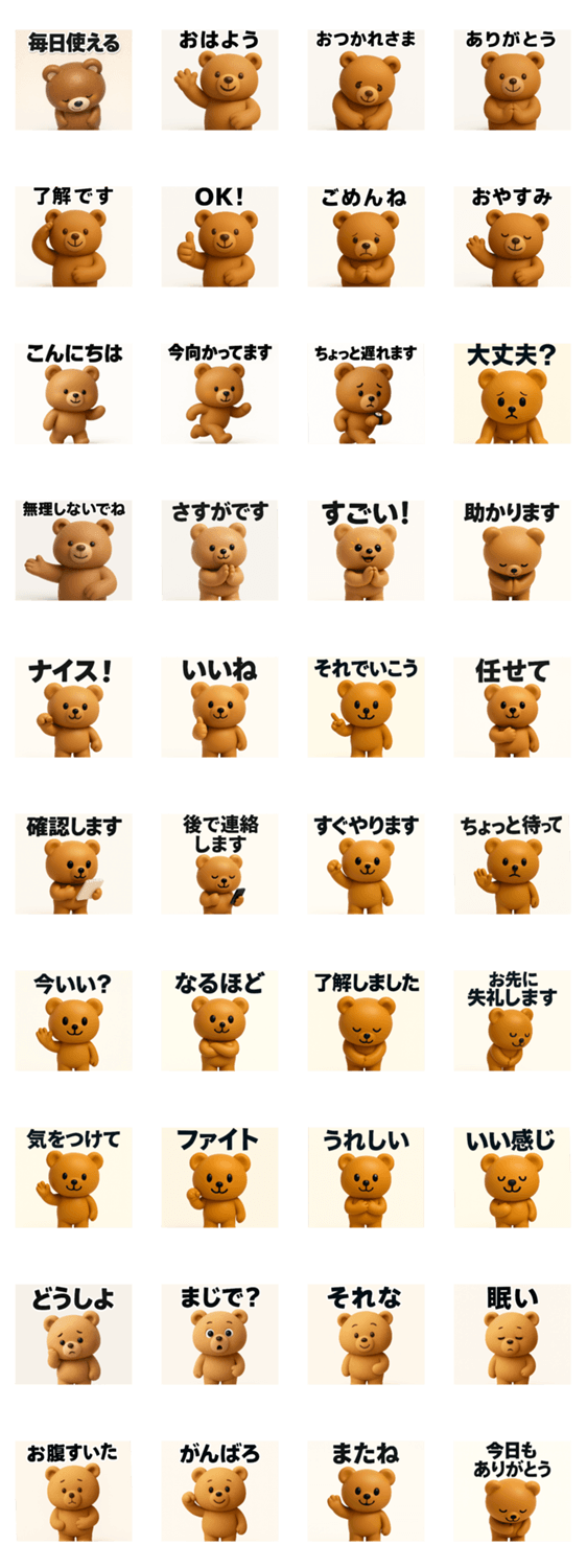 | スタンプ説明 | 毎日使える万能スタンプ40個セット。挨拶・仕事・友達LINEまでこれひとつでOK。大人かわいい3Dゆるクマが、やさしく気持ちを伝えます。 |