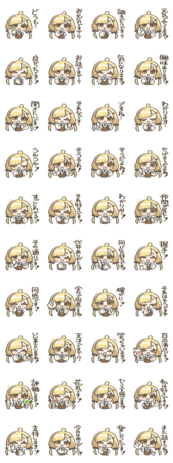 | スタンプ説明 | 好きな事の話題だと元気になる系のシャイな性格な女の子の、ミニキャラ+白フチ付き台詞のスタンプ。日常会話で使える肯定的・ポジティブな返答、リアクション表現多め。 |