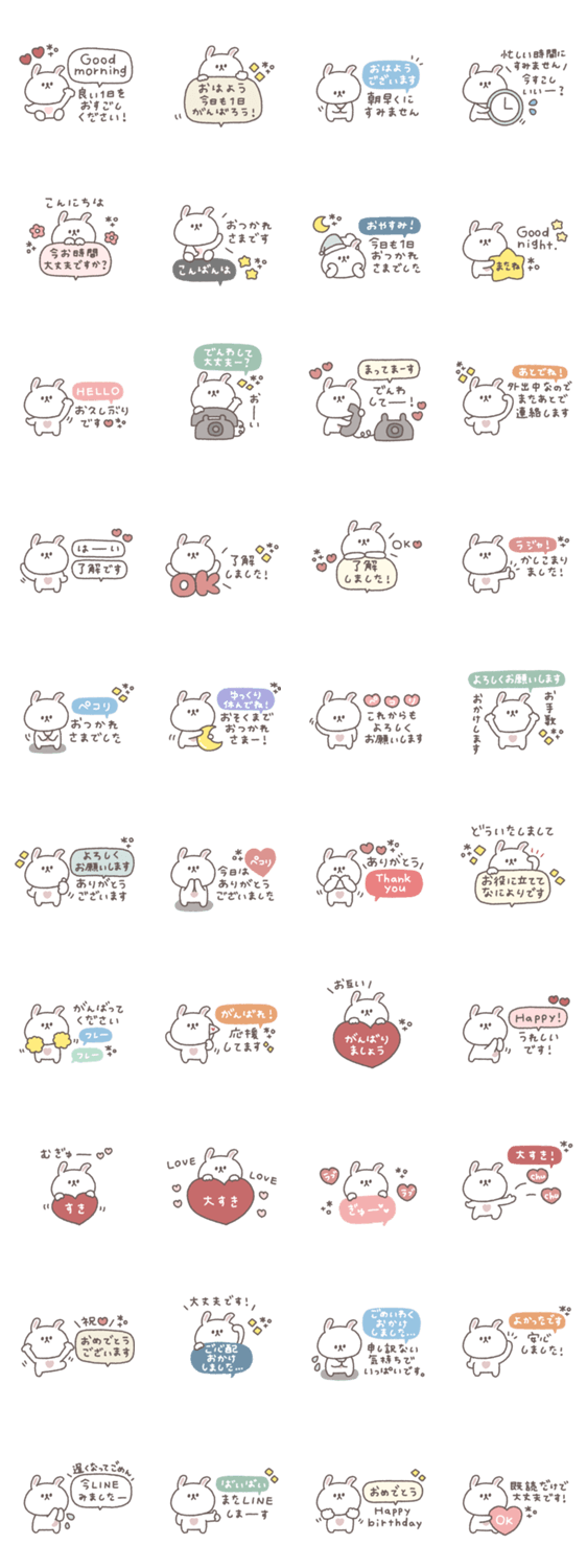| スタンプ説明 | 一つあると便利なかわいいうさぎのスタンプです。 うさぎ/大人可愛い/シンプル/あいさつ/吹き出し/くすみカラー /長文 |