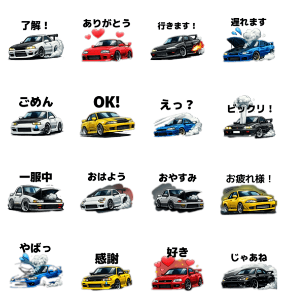 | スタンプ説明 | 爆速感ある走り屋カーで気持ちを表現!テンション高めから日常会話まで幅広く使える文字入りスタンプ。友達・家族・車仲間との会話におすすめ! |