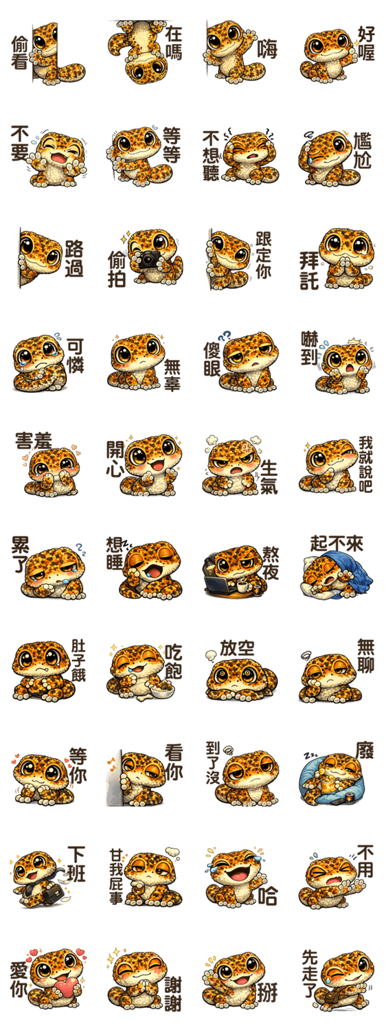 | スタンプ説明 | A big-eyed giant gecko who sticks to walls, peeks around, and lives the funniest lazy daily life. |