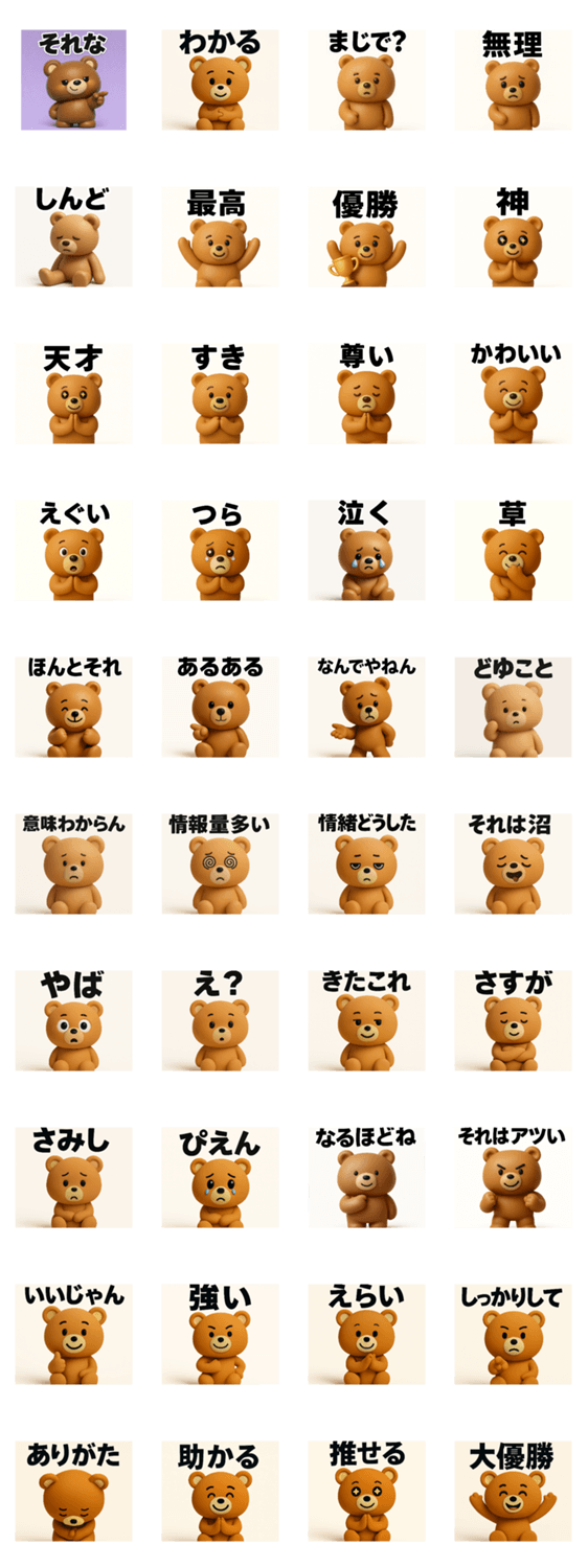 | スタンプ説明 | 「それな」「無理」「優勝」など今すぐ使える共感ワード40個。リアクションが秒速で返せる、大人かわいい3Dゆるクマシリーズ。 |