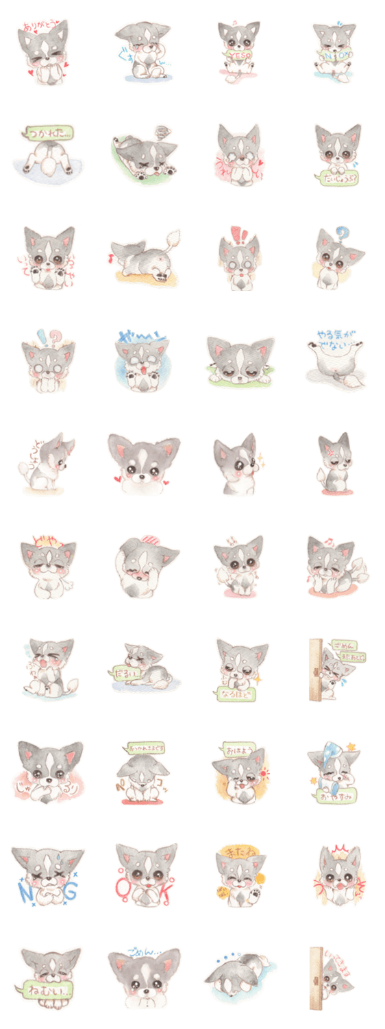 手描き水彩絵ならではのあたたかみのある色合いに、特徴のある模様やしっぽが可愛い、表情豊かなチワワのスタンプです♪ ほんわか・きゅんと癒されますように^^