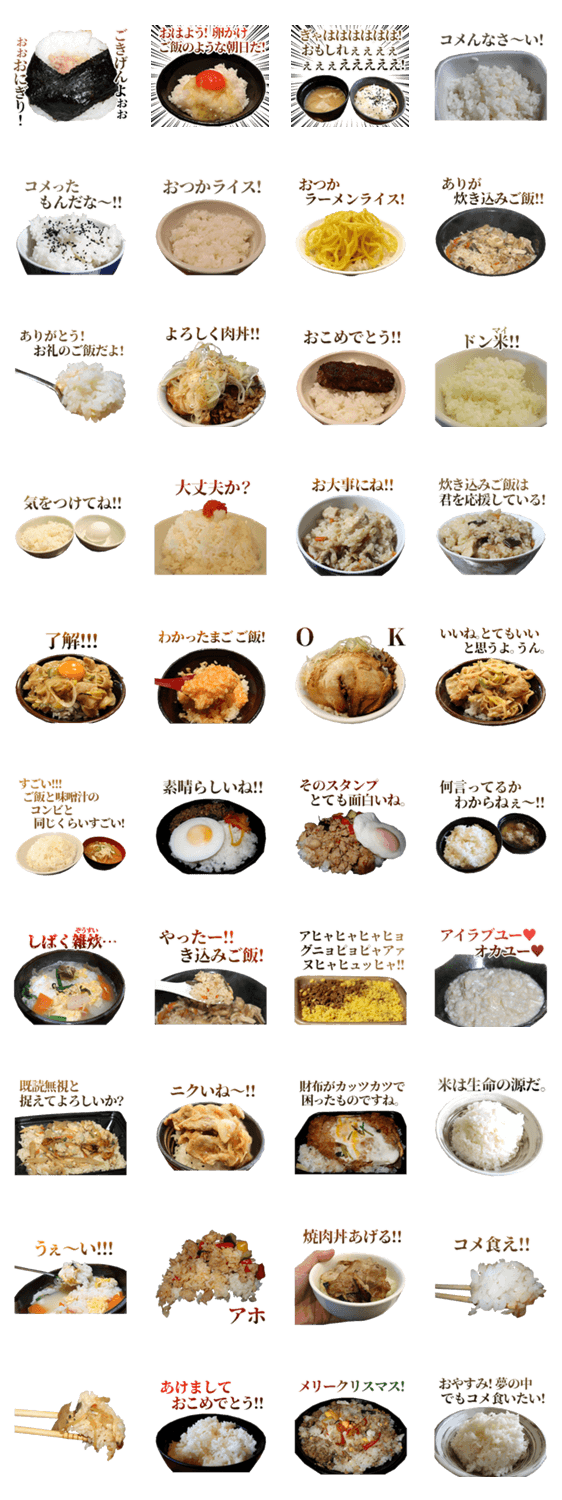 | スタンプ説明 | ご飯の、一年中毎日使えるスタンプです。ダジャレ。ゴハン、コメ、白米。炊き込みご飯、卵かけご飯、おにぎり、ライス、Rice、飯テロ。あけおめクリスマス。実写食べ物。 |