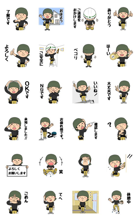 | スタンプ説明 | 仕事でもプライベートでも使いやすい、内装屋(クロス屋)さんの日常スタンプ。 「よろしく」「了解」「ありがとう」など、毎日のやり取りに使えます。 |