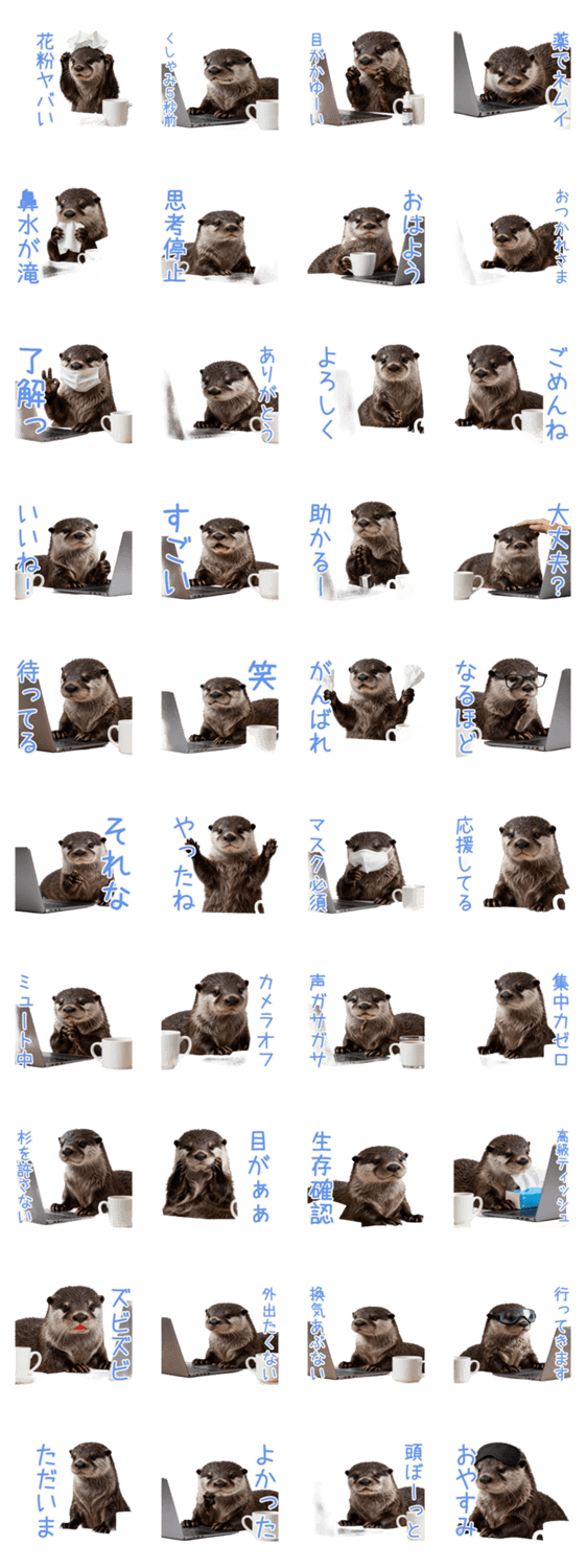 | スタンプ説明 | 在宅勤務カワウソの花粉症実況。リモートワーク中のサボりや集中力ゼロ、杉への怒りをシュールに表現。同僚や友達への生存確認や言い訳に使えるネタ系です。 |
