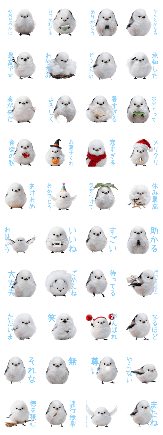 | スタンプ説明 | 悟りを開いたシマエナガが全てを許容します。春夏秋冬の行事から「徳を積む」挨拶まで。毎日使える言葉で家族や友人を癒しましょう。 |