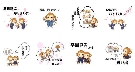 にぎやかな、おさるファミリーのスタンプ!ちょっぴり切なくて、でも喜びにあふれた卒業の思い出を一緒にお祝いしましょう。