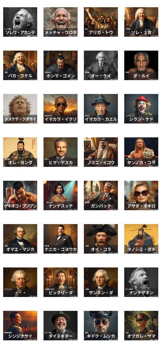 | スタンプ説明 | ※すべて架空の偉人です。 【架空/有名人/芸能人/おもしろ/面白い/歴史/外国人/ギャグ/言い訳/バカ/ネタ/爆笑/あいさつ/便利//英語/アホ/映画 |